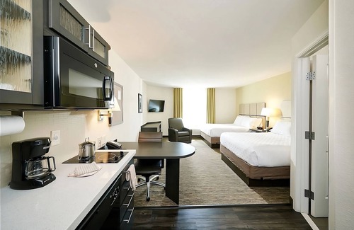 The hotel's spacious guest rooms are finished to a modern standard and feature either queen or twin-bed configurations. All rooms offer a range of convenient amenities, including a flat-screen TV with premium movie channels, free Wi-Fi, a living space, and a full kitchen complete with a stovetop, microwave oven, full-size refrigerator, cooking utensils, and a dishwasher.