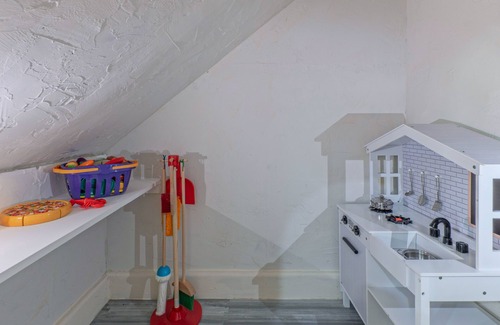 Your vacation home is situated on a quiet street with walking trails through the neighborhood. There's mountain views from the bedroom upstairs. From the minute you pull into the driveway you'll feel right at home! This two story home is very spacious as soon as you step inside. With 3,924 sq. ft. of living space everyone will have room to enjoy! As soon as you enter the house, you're greeted with the Game Room with a 70" TV with cozy sitting area to play board games. Enjoy bringing back some fun memories playing on the classic table top arcade game or challenge your friends to a game of electric foosball. There are lots of board games in the cabinets or grab the ones off the wall. The kids will enjoy the built in playhouse under the stairs. The playhouse is a show stopper!