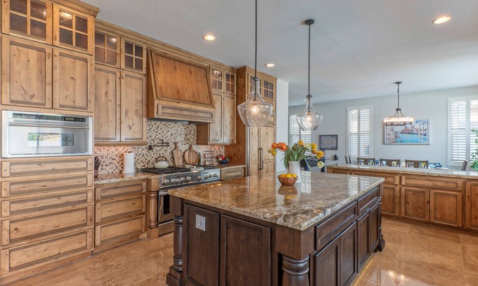 Show off your cooking skills in the chef's kitchen. Everything down to the spices and coffee is provided. The home is fully stocked with a blender, juicer, and toaster, right down to the mixer for baking. Have a meal at the large formal dining room or breakfast nook area. If you think the game room is a hit for the family, then check out the large family room! Veg out on the extra deep sectional sofa and cuddle up reading a book next to a cozy fireplace with an 86" flat screen that will make you not want to get off the sofa. The famous Nugget Ice maker has been a huge hit at every vacation home so we brought it here too!