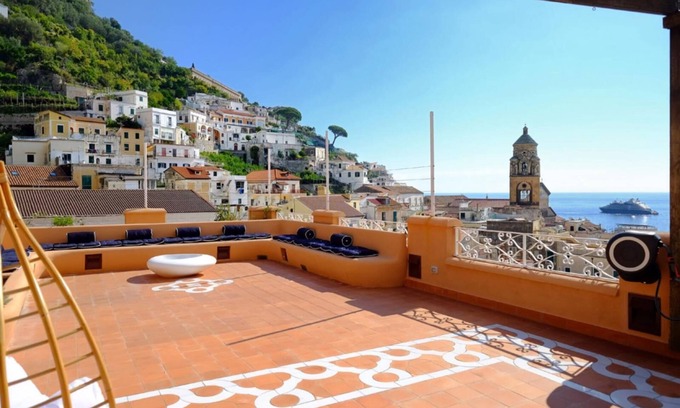 The apartment was completely renovated in 2020 in collaboration with a renowned a team of Italian architects. It is equipped with luxury furniture, electrical appliances, together with premier quality wooden floor. It has 3 bedrooms, living room, 2 kitchens, 4 bathrooms. The apartment is extremely quiet and offers great privacy to the guests. There is also an exclusive top roof terrace of 90sqm, easily reachable through a stylish inner staircase with a magnificent view combining the picturesque surrounding mountains, the Cathedral doom and the Amalfi sea. In the top roof floor, guests will also enjoy fully equipped kitchen and cozy living room for pure relaxation.The house is made up of:An entrance with a large living room with access to two balconies overlooking the mountains and the sea and furnished with a sofa, armchairs and TVThe lounge is connected to a customized and finely equipped kitchen (which also include food a food processor) complete with a spacious dining tablea small bathroom with sink and toilet decorated with handmade tiles.From the living room a long corridor leads to the 3 bedrooms and bathrooms:A bedroom with 2 single beds, nightstands, built in spacious wardrobe and windowA double bedroom with night stands, built in wardrobe and a balcony. The two bedrooms are served by a spacious toilette with sink, toilette and shower all decorated with handmade tiles.A bedroom with TV, built in wardrobe, balcony and ensuite bathroom with sink, toilet and shower all decorated with handmade tiles.