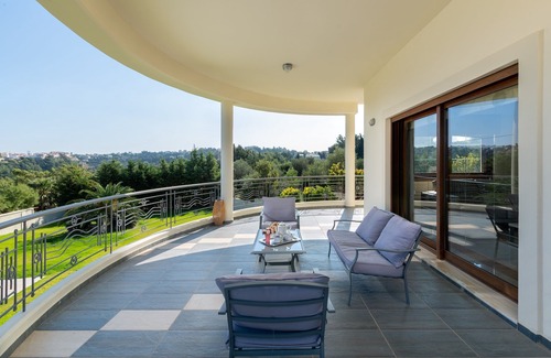 Amaltheia Villa is a 3 story building; guests can use the first and the second floor. Villa has 5 luxurious bedrooms, 3 of them have double beds , 1 of them has a double bed with a double sofa bed and the 5th bedroom has 3 single beds . Also needs to be mentioned that all the beds are single and 11 in total which can be used as double as well . All bedrooms are fully air-conditioned. The master bedroom is offered in classical tones, it has a king size bed, a living room with a double sofa bed and an internal bathroom with Jacuzzi. Also, there are 4 bathrooms as well, 2 of them with a bathtub,1 of them with a shower and a WC. There’s an open plan kitchen, fully equipped for any meal preparation. The wide living room, which is decorated in earthly tones is quite convenient and offers 2 seating areas with sofas,1 cozy seating area with antique rocking chairs and has a TV screen as well as a fireplace. There is free Wi-Fi access throughout the property. On the first floor there’s a furnished veranda that overlooks to the forest and on the second floor there are beautiful balconies leading from the bedrooms. Outdoors, there’s the wonderful private swimming pool with its sunbeds surrounded by the wide garden. There is outdoor furniture where you can enjoy your meals and BBQ installation for al fresco culinary experiences. The garden is pretty large and can host up your special events. A small Greek herb garden is also available. The ground floor of the building is not for use and has a separate entrance from the available floors because in the polite owner will be living there.