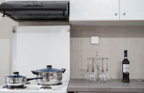In the living room there is a specially designed area hosting a Double Bed with high quality linen and a closet for extra storage room. Also, in the same room there is a sofa which can turn into a bed-sofa for two under request. The place is accommodated with air-conditioning and free Wi-Fi access.