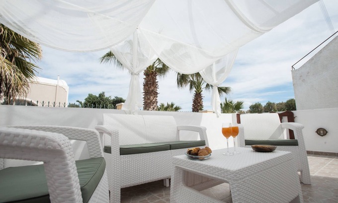 The porch comprises an airy tent, a stylish white outdoor sofa armchairs and coffee table; suitable for relaxation, reading, enjoying the sun and having BBQ any time you wish.