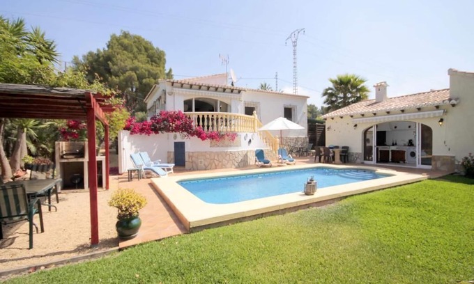Wonderful and romantic villa in Jávea, Costa Blanca, Spain with private pool for 4 people. The house is situated in a coastal and residential area and 4 km from El Arenal beach. The house has 2 bedrooms and 3 bathrooms. The accommodation offers a lot of privacy, a wonderful lawned garden with gravel and trees and a wonderful pool. Its comfort and the proximity of the beach and places to go out make this a fine villa to spend your holidays in Spain with family or friends.