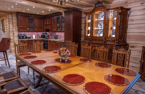 Impressive dining area seating up to 14 guests, featuring Royal Albert dinner set perfect for a special occasion. Coffee table with comfortable seating area & smart TV.