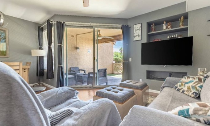 This delightful condo in the Beautiful Val Vista Lakes Area in Gilbert Az with 2 bedrooms offers a warm and welcoming space for renters seeking Comfort with a king size bed in the Master Bedroom, a walk in Closet and his and her master bathroom vanity accommodations. The second Bedroom has a Trundle bed that sleeps 2 People and features a work from home office area. The living room features a cozy sofa bed, Condo Sleeps six guests comfortably with TV’s in every room and amenities like Alexa for your listening pleasure and refrigerated Air Conditioning and WiFi, guests will feel right at home. There is a small outdoor patio for lounging,Smoking etc. The kitchen comes fully equipped with stainless steel appliances and all the essentials you will need to create your favorite culinary specialties plus plenty of counter space and cabinet storage. It opens up to a dining area that comfortably seats four. There is a one car garage that has the laundry facilities as well as extra freezer space and more than enough room for bicycles, motorcycles, etc. No room to park a car though.