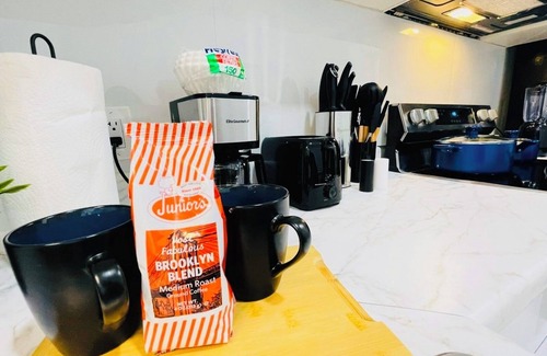The space features 1 queen bed, 1 bunk double bed, a cozy living room with a sofa bed, and a bathroom with a shower and hair dryer. Guests can enjoy out new AC machine, iron, hairdryer and other essentials as body wash, shampoo, conditioner. Kitchen has a coffee machine, blender, more items-utensils.