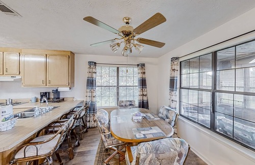Climb up a flight of stairs to reach the home and its front deck. Upon entering, this air-conditioned home away from home boasts a cozy and welcoming open floor plan. Spread out comfortably on any of the sofas and get ready for an entertaining and tranquil evening after spending the day exploring the area and fishing. The TV is equipped with cable to keep you entertained during your stay. Put on the chef's apron and treat your guests to delicious homemade meals prepared in the well-appointed kitchen, which is complete with all the essentials, including a dishwasher and two coffee makers. Another great spot to unwind is the screened porch, which has been furnished with plenty of comfy seating. Other perks include a cornhole game, free WiFi, and a washer/dryer.
