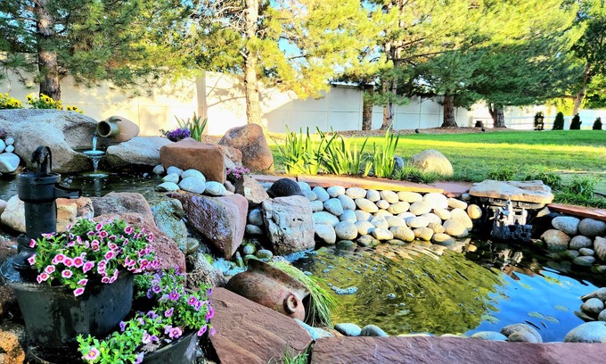 -Amazing 0.6 acre backyard with a pond, patio, sandbox, fireplace including a seating area and a grill. At night the entire house and backyard are illuminated with professional lighting.