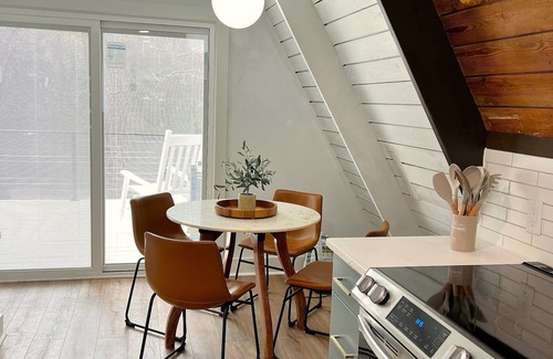 Be among the first to experience this amazing A-Frame. Rich in history, the house features the original wood plank walls and beams and spiral staircase. It has been lovingly renovated and furnished in mid-century style with luxury linens, a stocked kitchen, and all necessary amenities. This unique retreat offers a private bedroom with king bed and access to the bathroom. The open loft offers 3 twin beds, the original spiral staircase (narrow), and a desk. And an outdoor deck is the perfect retreat surrounded by trees overlooking the 2-acre pond.