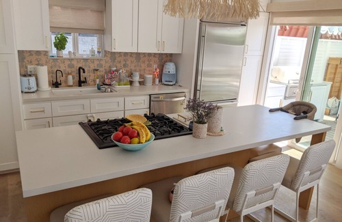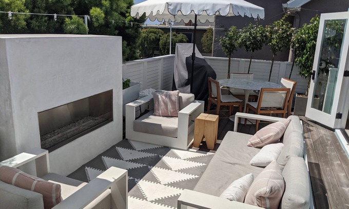 Designer home in the heart of downtown Manhattan Beach, just steps from the ocean and all the best restaurants + bars! Features include amazing deck with fireplace, BBQ, cozy lounge seating, dining table and a Peloton bike. Inside we have a large 65" TV, a large comfy couch and a Sonos speaker system. Our main bedroom features a comfy large King bed and full bathroom. Kitchen is fully equipped with top-of-the-line Monogram refrigerator, stainless range, toaster and SMEG coffee maker.