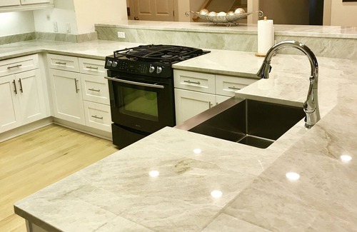 The kitchen has plenty of counter space with bar stools for friends to gather round and talk while you prepare your meals for grilling on the outside porch grill.