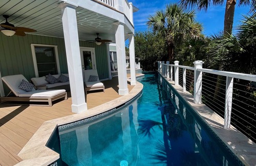 It is off the first floor of the house that you can access the new pool and jacuzzi area. The pool, which runs the length of the beach house on the beachside of the property is not your ordinary pool - we are fondly calling it our Palms Porch "lagoon"or "water feature" - as it's over 50 feet long but gets as narrows as 4 and 1/2 feet in some places! We love it as it meanders along the side of our house and is so fun and relaxing to swim in! Depending on the month - and with enough advance notice - the pool can be heated for an additional daily fee. (Please let us know before you finalize your booking if this option is of interest and we will quote the daily cost of heating depending on rental month).
