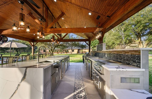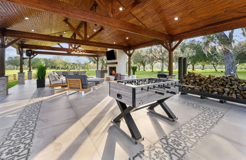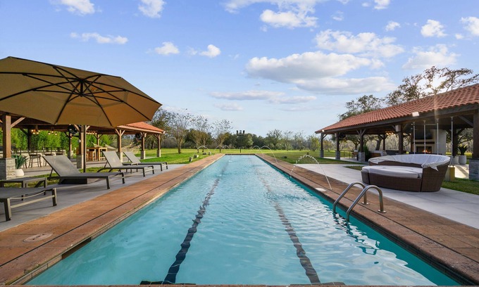 Enjoy a private space to call home during your sunny TEXAS stay! Large stand-alone gazebos with an outdoor gourmet kitchen. The property can accommodate up to 24 guests. The property is equipped with everything necessary to make your stay unforgettable.! The outdoor gazebos are equipped with a full outdoor kitchen, hammocks, smart TV, soccer table, ping-pong table, and many other games for the family. You can relax next to the Olympic pool while cooking out, or fishing at the boat house next to the river.
