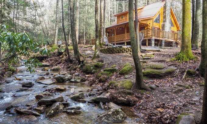 Escape to this charming rustic-luxury log cabin situated beside a cascading creek in the peaceful woods of the Blue Ridge Mountains.