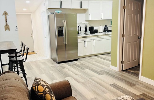 Come relax in our cozy spacious guesthouse. The guesthouse was built in 2024. It has an open layout and can accommodate up to four guest. There is a private bedroom and a sofa couch that is equally as comfortable. The guesthouse has a 50" TV, Wi-Fi, full size refrigerator; with filtered water and ice, kitchen bar table, and Keurig machine. You can prepare all your meals in the full size kitchen and end the day with a relaxing shower. There is nothing little about this house!