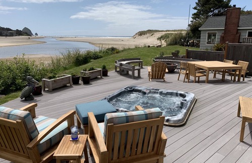 Amazing estuary and ocean views! Relax on the deck with the fire-pit & jacuzzi | House in Cannon Beach
