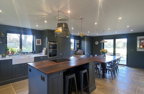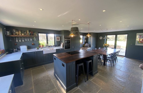 A beautiful large kitchen with surrounding views of the garden, It has a large informal dining table that can seat 10, french doors leading out to the garden/patio outside dinning, The kitchen also boasts an island ideal for working from or cooking at. Various cooking appliances, Double butler sink, dish washer, coffee machine, Dualit toaster and kettle.