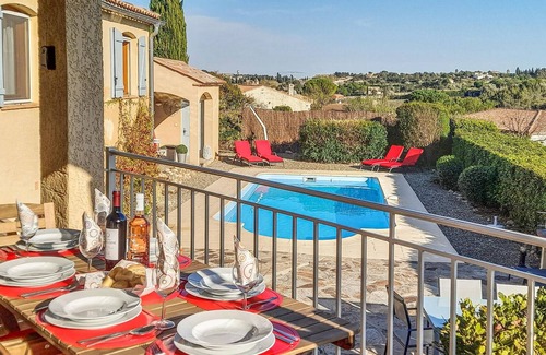 This beautiful south-facing vacation home has a private pool and a fantastic view of the vineyards of Cruzy, in the Hérault, 11 km from the Canal du Midi.