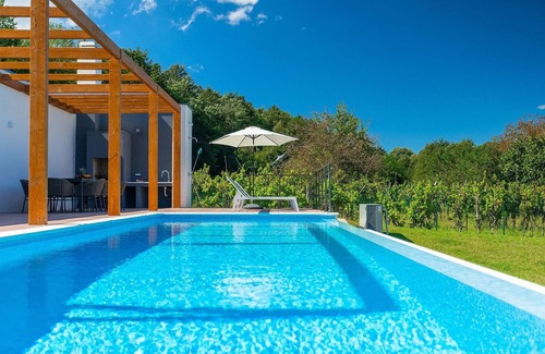 In the midst of green countryside, surrounded by forest, vineyards, olive and fig trees, you will find the peace and seclusion you have been longing for. Our Villa Istria Green is truly an oasis of peace on the east coast of Istria, just 12 km from Rabac. The modern first floor villa with 5 bedrooms can accommodate up to 10 guests and offers more than enough comfort for a relaxing vacation with family and friends. The refreshing 48m2 swimming pool forms the centerpiece of Villa Istria Green alongside the spacious garden. Here you will experience the best moments of your vacation with your loved ones: Refresh yourself in the pool, splash around with the kids, relax on one of the sun loungers while the teenagers play soccer or volleyball in the garden and enjoy the Croatian sun. Enjoy breakfast together at the dining table on the large terrace and spend cheerful barbecue evenings with your loved ones while preparing local specialties on the charcoal grill. The stylish interior is bright and very comfortably furnished. The open, fully air-conditioned living area with a comfortable sofa and TV, the dining area and the fully equipped kitchen create a feeling of "home". Five comfortable bedrooms with comfortable double beds promise restful nights and each has its own bathroom with shower. Each of the rooms is equipped with its own TV and air conditioning and offers direct access to the outdoor area. Book the luxurious Villa Istria Green and spend an unforgettable vacation with your family surrounded by the untouched nature of Istria! Experience Istria from its most beautiful side and visit Villa Istria Green. Surrounded by a forest, vineyards and olive groves, this unique villa is located in the small village of Krsan, just 12 km from the nearest beach in Rabac. Secluded yet not too far from amenities such as restaurants, bars, supermarkets and everything else you need for a carefree vacation, the location is perfect for getting to know Istria. Explore the heart of Istria and visit Pazin, where you can enjoy great gastronomy and a zipline over the gorge of Pazin Castle. Enjoy the best wines in Motovun or stroll through the streets of the smallest town in Croatia: Hum. Take a day trip to the historic city of Pula or discover the most beautiful beaches on the coast. Let yourself be inspired, spend a dream vacation and return soon. Please note that this property may accept younger groups of visitors on request. Please contact us to check this. A younger visitor group at this property is a group of people aged 25 years or younger. If you are a younger group of visitors [or planning a stag party] you may be asked to pay an additional deposit on arrival. If any damage is caused by guests in your party, the cost of repairing any damage/replacing damaged items will be deducted from the deposit. The temperature of the heated swimming pool depends on external factors, including weather conditions, and therefore the water temperature cannot be guaranteed.