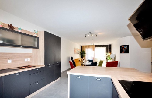 Step inside and feel at home from day one in this inviting holiday home, which welcomes you with colourful accents and modern comfort. Prepare your favourite dishes together in the open, fully equipped kitchen and celebrate your meals at the stylish dining table. After an eventful day out, make yourself comfortable on the sofa and spend time together playing a board game or watching an exciting film.