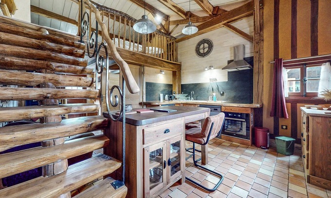 Part of a former homestead, this charming vacation home welcomes you in a charming and modern light shining vacation home and two levels. Decorative stone walls, a beautiful wooden staircase and exposed wooden beams on the ceilings create a soothing feeling of space. Here, rusticity is combined with coziness and invites you to relax from your everyday life. For your entertainment, a table tennis table is available, as well as an open plot with an open terrace.