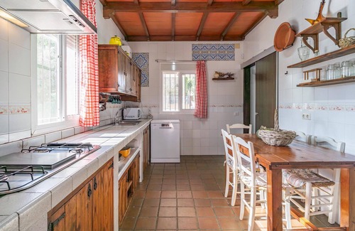 Start the day in your holiday home in Montilla, north of Malaga, with breakfast on the spacious, covered terrace while you enjoy the view of the inviting pool. Make yourself comfortable on one of the sun loungers or take a refreshing dip in the pool to get the day off to a relaxed start. The spacious living room invites you to linger. Enjoy the cosy atmosphere in front of the wood-burning stove and the lovingly designed interior on the comfortable seating.