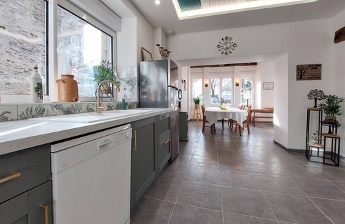Welcome to the cosy ambience of this quietly situated holiday home, where guests of all ages will feel at home from day one. Spend time cooking together in the spacious, modern kitchen and enjoy your meals in the light-flooded dining area. Afterwards, make yourself comfortable in the warm ambience of the living room with its wooden beamed ceiling for an evening of games.