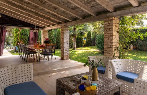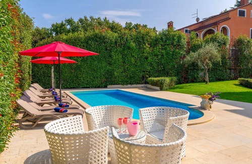 Villa Duga is a beautiful and luxurious villa located near the beautiful town of Pore. It occupies a living area of 320 m2 and consists of 3 floors. The villa is equipped with high-quality, rustic furniture and offers everything you need for rest and relaxation with family or friends. In the living room, furniture, home cinema and a fireplace create a lovely, relaxed atmosphere. The kitchen is fully equipped with all the necessary appliances for fine cooking. The villa has 6 modern and tastefully decorated bedrooms with air conditioning. Six of them with double beds. Five of the six rooms have direct access to the terrace or balcony. Five of the six rooms have a bathroom/WC with shower. The beautifully decorated, fenced garden offers a barbecue, a green landscaped garden and a terrace with comfortable seating and a summer kitchen. There is also a swimming pool (36 m2) with sun loungers and an outdoor shower. Vila Duga near Pore is only 2 km away from the town centre and for all sea lovers the nearest beach is only 1200 meters away. Nearby there are shops, restaurants and taverns for those who want to try Istrian cuisine. There is also the possibility of using the golf and tennis courts, boat hire and water sports in the immediate vicinity. Pets are allowed in this property at the owner's discretion or for a fee. Please note that this property does not accept youth groups or stag and hen parties. A youth group at this property consists of people aged 28 years or younger. Do not book this property if you are a youth group or stag party as your booking will be refused after booking, which may also be on arrival at the property or during your stay, and you will not receive a refund.