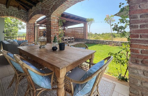 On the outdoor terrace, you will refresh yourself in the 32 m2 swimming pool, where you will play and have fun with the children, and those who want to soak up the sun's rays will be able to do so on 8 deckchairs. There are also umbrellas and garden furniture on the terrace, perfect for drinking morning coffee or serving breakfast. You can also use the outdoor charcoal or wood grill, and you will try the prepared food on the outdoor covered dining table.
