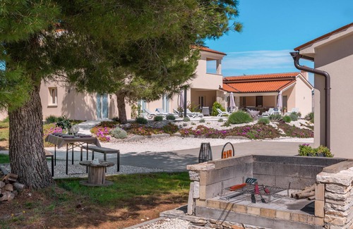 This luxurious holiday home with pool is located in a small Istrian village next to Vodnjan, not far from Pula, the largest city in Istria. The house is situated on a fenced plot with a beautiful olive grove and offers many leisure activities. Every detail in the house has been lovingly planned to maximise comfort and ensure a pleasant stay. There are four bedrooms, three of which have en-suite bathrooms. For your physical wellness there is a fitness room, sauna and massage chair. You can spend convivial hours in the Istrian konoba. Enjoy the many covered terraces and the sun deck by the pool as well as the Mediterranean garden with aromatic herbs and plants.