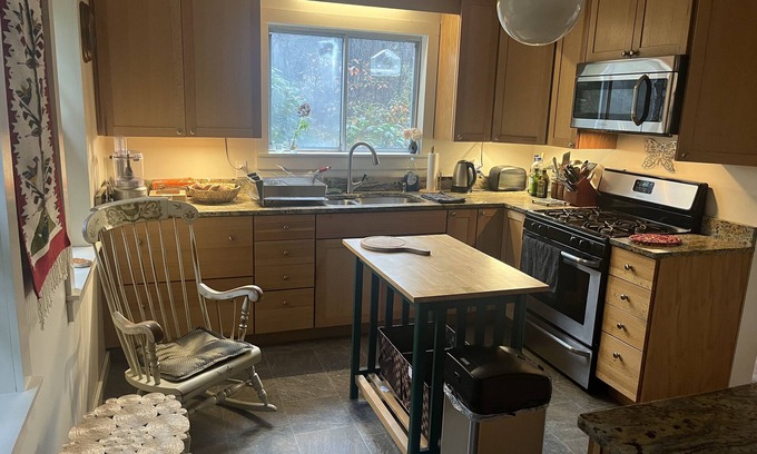 Absolutely Charming! Fully equipped gourmet kitchen. Surrounded by 100's of acres of forest, this location is quiet, private, and serene; and yet it is only 10 minutes drive to Belfast. Enjoy, songbirds, deer, wild turkeys, and other wildlife in the back yard while sitting on the back porch or grilling your dinner on the outside barbecue. In spring and summer the yard is ablaze with color, surrounded by rhododendrons; then it's fall with stunning leaves! 1 hour to Acadia, 1/2 hour to Camden.