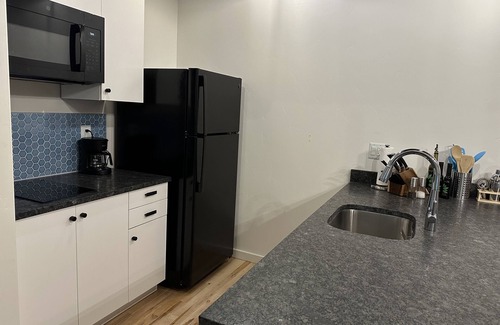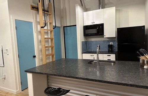 Relax in this modern industrial studio loft in downtown Redmond with easy access to shops, restaurants, parks, the airport, and the Dry Canyon Trail. This functional space has a king size bed, full kitchen, comfy living area, full bathroom, and a cool workspace in the loft. BONUS - Also included is a 10'x10' storage room in the basement for your bikes, skis, or whatever you happen to bring along and want to keep secure. With fast internet and a wine bar downstairs, what more could you ask for?