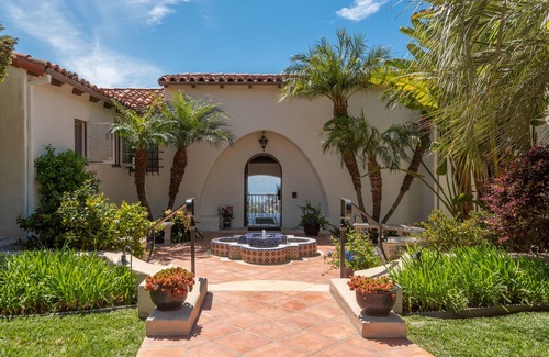 Each of the five bedrooms comes with walk-in closets. The master bedroom and baths are spacious, convenient, and is complete with a beautiful view of La Jolla and the coast! This Spanish Villa is situated on a larger lot, in the La Jolla Country Club neighborhood of San Diego, California. It features classic Spanish Villa appointments such as Saltillo tile flooring, tile roof, elegant wrought iron railings inside and out and beautiful gardens and terraces with palm trees and flowers surrounding the house. This residence is fenced and offers a great deal of privacy for guests. There is a three-car garage and a driveway which fits 3+ additional cars (6 car maximum).