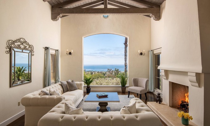 As you enter the property, you are greeted with lush landscaping and a water fountain that leads you to the front door (which has a window that opens to ocean views). The middle floor off the entryway features a beamed living room with magnificent ocean views from a historical window designed by Architect Thomas Shepherd (La Valencia Hotel), with sofa seating and a gas-burning fireplace. Adjacent is a family room with comfy sectional seating, a flat-screen TV and the Pasadena sleeping porch, with ocean and sunset views, where you can kick back and relax on one of the sofas, sipping your beverage of choice.