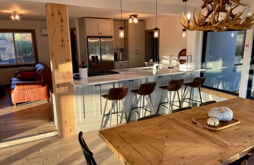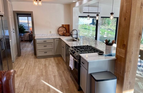 Comforts of home greet you when you walk in the front door! The 1900 sq ft cabin sleeps a total of 10 and was thoughtfully remodeled from floor to ceiling in 2021. The fully equipped kitchen and huge center island with gas burning range, is the perfect place for preparing meals for family and friends. And the best part is the open view while you're cooking! There is plenty of room for everyone to gather around the extra-large dining table to share meals and even more seating at the island. A perfect setup for holiday meals. There are 3 main living areas to relax in: a cozy hearth room off the kitchen with wood burning stove and flat screen TV, a sunken living room with lots of seating that looks out on the deck and the lake beyond, and a comfortable den for watching movies or playing board games. The layout is open and the expansive windows bring the outdoors in and invite you to sit back, relax and enjoy views of the woods and lake. There are 3 bedrooms and two full baths: two beautiful master bedrooms with queen beds and flat screen TVs , and a kids room that sleeps 4 with a bunk bed and a speedboat trundle bed . The sofa in the den also folds out to sleep an additional 2 guests. The laundry room is equipped with a washer and dryer as well as a folding table for your convenience.