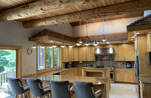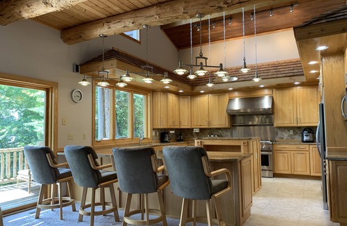 Beautiful Kitchen for Entertaining! Fully Furnished for Cooking - Stainless Steel commercial appliances & Dishwasher. Comfortable Seating at the Kitchen Island, Dining Table for 12, Adjacent Outdoor Decks Overlooking the Lake. The Decks Feature Outdoor Seating and a Gas Grill. The Kitchen Overlooks the Dining Area and Living Room.
