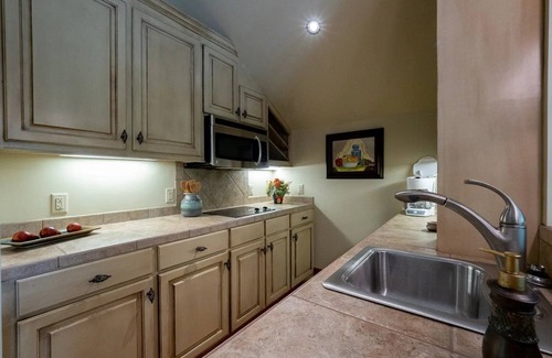 The Boat House's 850 sf living space offers and open floor plan with King bed, kitchenette and full bath.