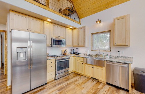 Head back after a fun-filled day out and walk in through the front door to find pleasant interior decor. Look upwards in awe at the tall ceiling in the living area and rest your head down on one of the comfy pillows on the couch for a quick power nap. if you wake up hungry, look no further than the gorgeous full kitchen, complete with all the stainless steel appliances you'll need in order to whip up an unforgettable mealtime masterpiece for everyone! Afterward, step out onto the balcony around sunset and take in the breathtaking view of the calming waters of the lake below. Around nighttime, head back inside and warm up by the fireplace with a nice cup of hot cocoa in hand.