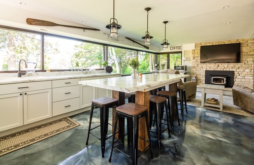 Large open format kitchen, including an 8’ long bar stool high table and eight stools for family seating