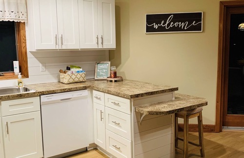 Our property also includes: two aerobeds, washer & dryer; full kitchen with dishwasher; dining area with table; TV with cable and internet; spacious living space with all window views that lead to a large deck with tables/chairs/grill; fire pit; small bar area; dock with boat lift; 2 kayaks; stand-up paddle board; beach toys; life vests for water sports; and a large driveway for parking trailers/ATVs/snowmobiles.