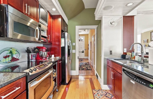You'll feel right at home at Parker House. Our comfortable 4-bedroom, 2 ½-bath home offers both sanctuary & historic charm for eight guests. The interior features antiques, original pine floors accented with colorful area rugs & gorgeous natural light throughout. With the main (parlor level) floor featuring an open floor plan & soaring ceilings, each space feels unrestricted, yet cozy. Open the front door to reveal the classic turned staircase, antique chandelier & Eastlake hall tree. Step into the living room & choose a favorite chair as you recap the day's activities or plan for tomorrow. This parlor level is also perfect for entertaining the family or friends. Through its pocket doors, it opens up to a spacious dining room & bar seating that separates the dining room from the gourmet kitchen. At the end of the bar, you'll find two under-counter refrigerators to be stocked as you like.
