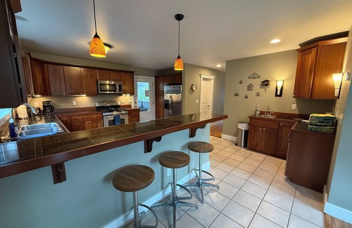 The Alyeska View Guest House is conveniently located near the base of Mt. Alyeska. This home is perfect for families! Enjoy the covered hot tub on the second floor deck. Two living areas with gas fireplaces give your group plenty of space. The large kitchen features stainless appliances, gas range, dishwasher and is well-stocked with everything you need. The 4 bedrooms each have new beds & mattresses, the master bedroom has a sleep number king bed. Each bedroom features a single sleeper sofa in addition to the bed. The fourth bedroom is located on the first floor and is a perfect space for kids; it's a large room with a TV (cable & Roku included) queen bed, single bed and sleeper sofa.