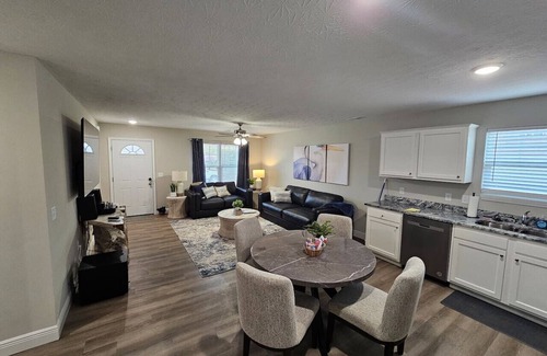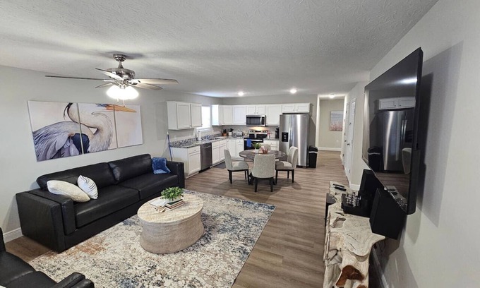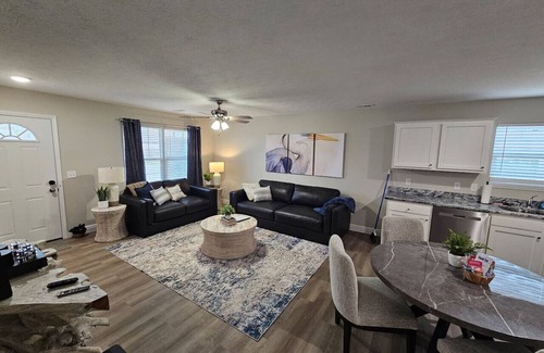 A blend of comfort and style greets you as soon as you enter our newly built ranch home. We have worked hard to create a home away from home feeling for you and your family. The open-concept floor design allows room for many guests. Everyone in your group will have room to mingle and relax.