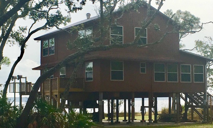 Truly Amazing River Views from every room! 3000 square feet of Pecky Cedar Walls! Sorry, there is NO DOCK at the property, but if you want to bring your own boat or rent a boat, there are wet slips within a mile. The Sunrises and Sunsets are breathtaking! Magical Moon and Star Gazing at night! Snuggle in front of the fireplace or enjoy lounging on the deck, watching the fish jump, and other wildlife. Beautiful Ochlockonee Bay Bike trails are right at the front of the neighborhood. Great Restaurants and Beaches are a short drive away. Kayak and Canoe rentals nearby. 2 bedrooms, plus an additional Queen bed, a full bed and a single bed in open upstairs area. The beach butler lift is out of service. Sleeps 9.