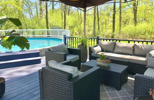 Your family will be close to everything when you stay at this centrally-located, peaceful residential neighborhood where you can stroll down a trail just across the street and in summertime splash in the above-ground pool while cooking dinner on grill. Fire pit at night with your favorite beverage. Spacious ranch with open floor plan. One master bedroom w/bathroom and 3 other bedrooms, hallway full bathroom, living room, dining area, fully equipped kitchen and an office or work space for those guests working away from office.Laundry in basement.