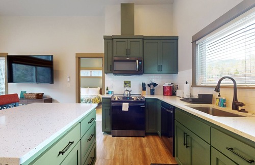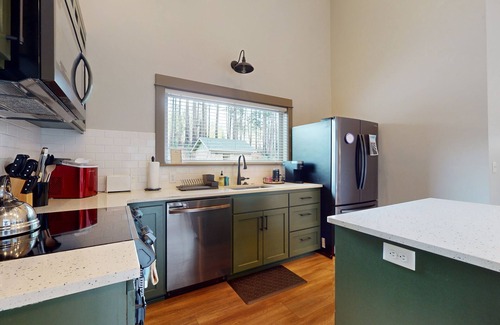 Inside the cabin, dramatic, cozy lounge furniture makes the open-concept living room, dining room, and kitchen an inviting retreat from the river and surrounding woods. Wind your own fishing flies from the comfort of the sofa or find yourself watching a movie on cable. An electric fireplace keeps the space intimate and down to earth. Complimentary in-home WiFi makes it easy to stay in touch on social media, browse the web, or catch up on some remote work. Celebrate meals as a group while the phenomenal views feed your senses around the charming wood dining table. Meal prep is made easier with help from a well-stocked kitchen and there's additional seating at the breakfast bar. Once the plates are cleared, leave the cleanup to the dishwasher while you dive into a good book by the fire or get lost in a puzzle or game. The cabin has a full kitchen and living room overlooking the river.