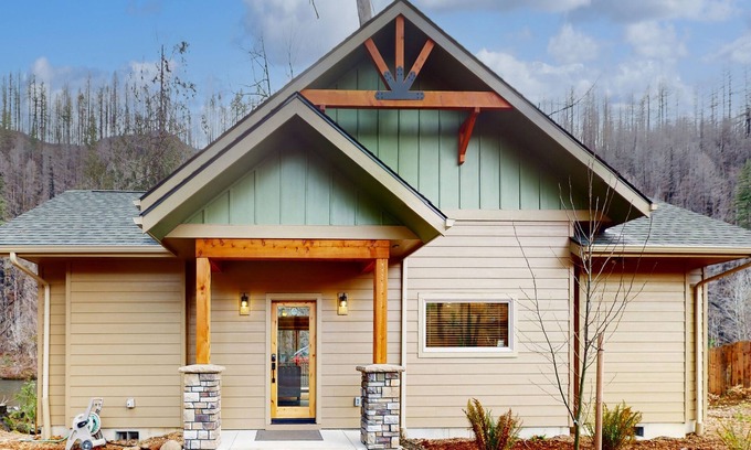 This beautiful home was recently rebuilt following the devastating Holiday Farm Fire of 2020 and is ready to welcome you to the scenic splendor of the McKenzie River. This inspiring riverfront cabin blends modern architecture with fantastic outdoor amenities that will make you feel like you’re floating on water! The cabin is ideal for two couples or a group of fishing buddies. Guests enjoy easy water access for fishing, rafting, or kayaking and the homes are midway between McKenzie Bridge and the Springfield/Eugene area, just 37 miles away.