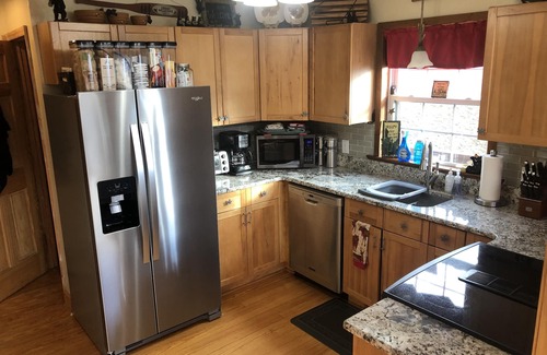 •Complete kitchen including Jenn-Air range, stainless side by side refrigerator with water/ice, stainless dishwasher and many small appliances (crockpot, sandwich/waffle makers, coffee pot)