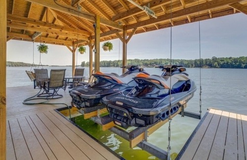 Have a blast with the family with this amazing cozy cabin with indoor fireplace and gorgeous water view and 450' of shoreline! 3 beds downstairs (Full in bedroom, full and twin bunk in common area, also 3 twins in loft). Our Tritoon and twin Seadoos are also available to rent or relax in the dock swing and enjoy the water!